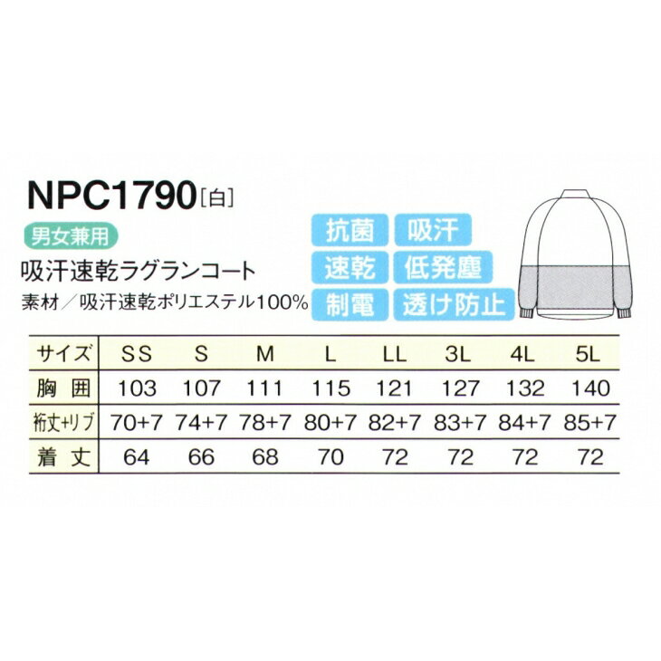 ギフトサービスについて 楽天国際配送対象店舗 (海外配送) Rakuten International Shipping■品番: NPC1790■商品名: P100%吸汗速乾ラグランコート WHITE■商品番号: NPC1790■発売年: 2020■品名: 吸汗速乾防透ラグランコート ホワイト■カラー: 白■サイズ: SS、S、M、L、LL、3L、4L、5L■性別: 男女兼用■季節: オールシーズン■掲載カタログ: その他/新製品■掲載ページ: 1【詳細】工業洗濯対応 速乾・吸汗生地 ロング丈コート優れた洗濯耐久性で、頻繁に洗濯をする作業場の強い味方です。
