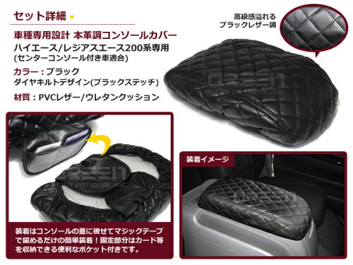200系ハイエース専用 ポケット付き アームレストカバー 標準/ワイド車 コンソールカバー コンソールボックス 内装 レザー DX S-GL ブラック 黒 レザー 革 皮 肘置き